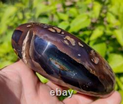 This is a stunning polished 1 pound 2.8 ounce agate amethyst geode from Uruguay. The natural brown, blue, and green banded agate has a large natural opening exposing the Amethyst geode core.