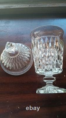 Ce conteneur en verre cristal est un petit récipient rond avec une finition brillante et un style art déco. Fabriqué en 1989, il présente un motif en diamant avec un couvercle, ce qui le rend adapté à n'importe quelle pièce de votre maison. Le conteneur fait partie de la collection Birds & Country Legacy et est conçu pour ajouter une touche de charme saisonnier à votre décoration. Fabriqué en verre et cristal, c'est une pièce décorative qui serait une belle addition à toute collection.